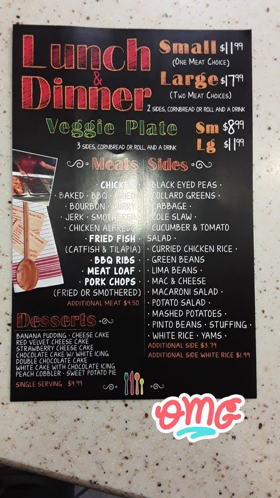 The menu celebrates a delightful array of classic comfort foods, featuring crispy fried chicken, smothered pork chops, and baked chicken, all expertly seasoned to perfection. Accompanying these mouthwatering meats are hearty sides such as mac and cheese, collard greens, and yams, crafted to evoke the nostalgia of home-cooked meals.